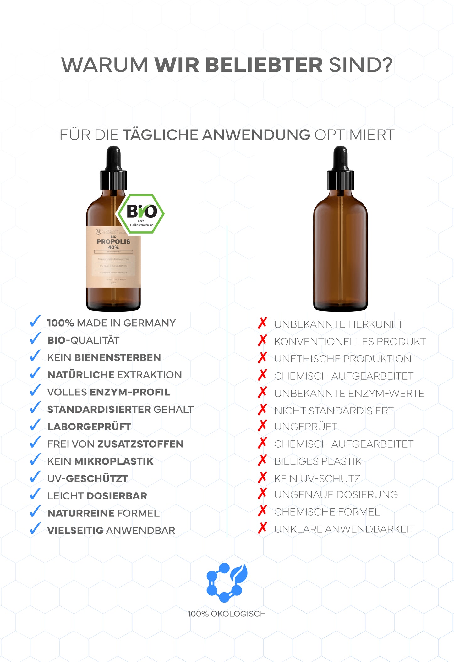 Das ist auch der Grund, warum Keyword-getriebene Erwartungen wie "Propolis Nagelpilz" oder "bei welchen Krankheiten hilft Propolis?" problematisch sind: Solche Begriffe ziehen in Richtung Therapieversprechen. Seriös bleibt man, indem man Propolis als das kommuniziert, was es ist: ein komplexes Naturprodukt, dessen Qualität über Rohstoff, Extraktion und Analytik beurteilt wird - nicht über Heilsätze.