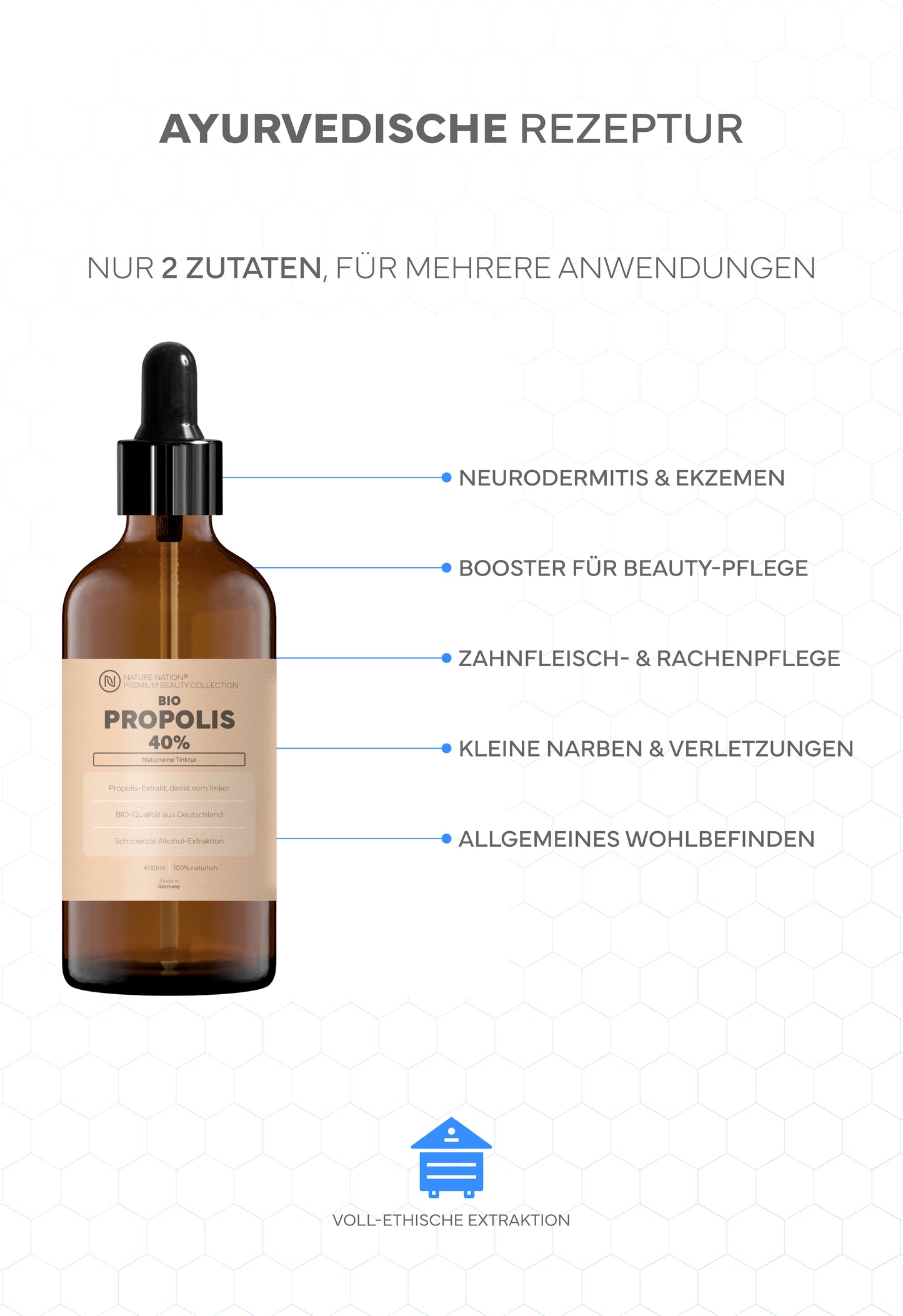 Dann kommt die Rezeptur: Wir setzen auf 2-Zutaten-Klarheit - Bio Propolis + Bio Weingeist. Keine Farb-, Geschmacks- oder Konservierungsstoffe. Keine Aroma-Optimierung, kein Blend aus Hilfsstoffen. Das ist nicht nur clean, sondern logisch: Je mehr Zusatzstoffe, desto weniger klar ist, was du wirklich beurteilst. Eine schlanke Propolis Tinktur lässt sich fachlich einfacher einordnen; und genau das schafft Vertrauen.