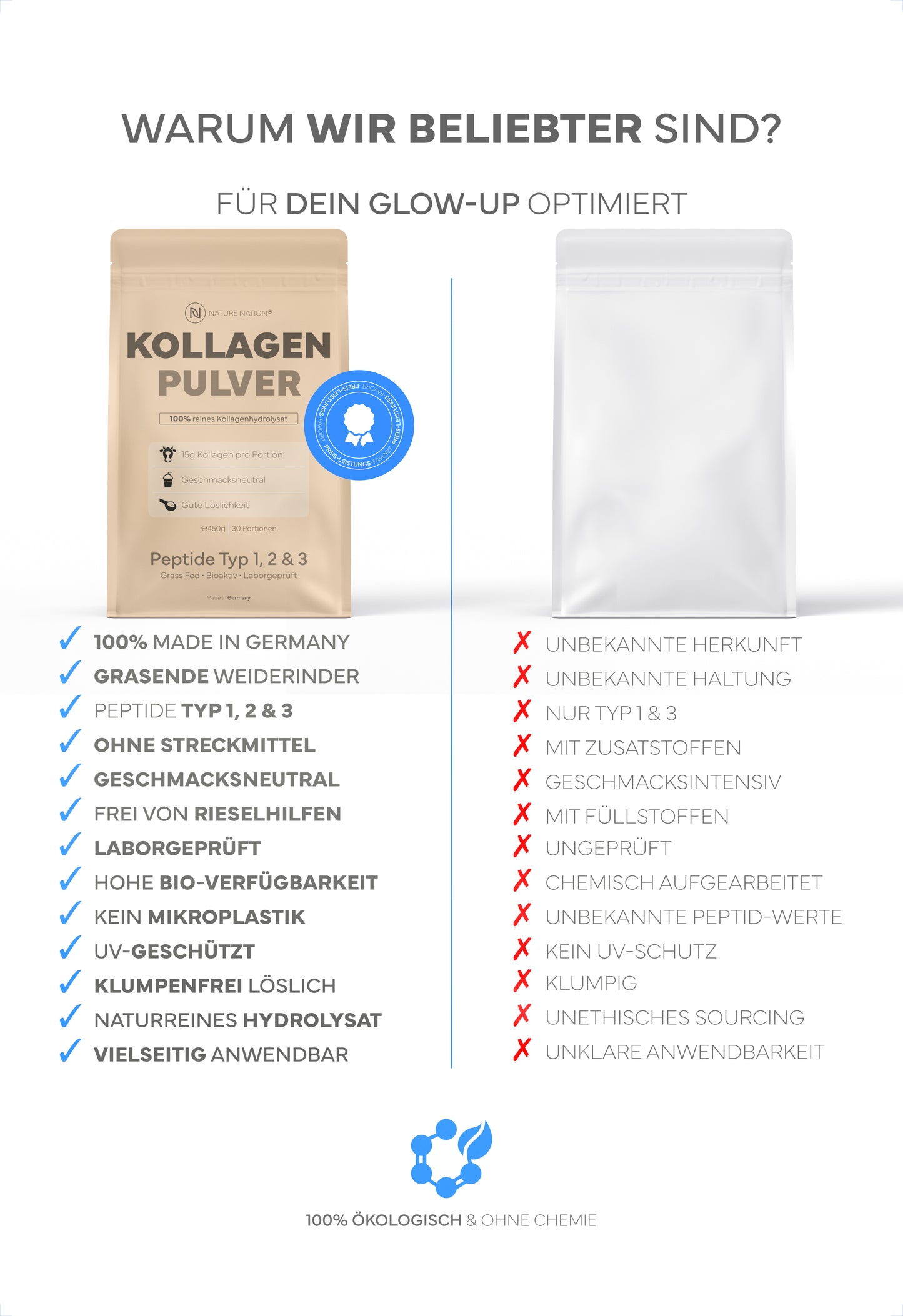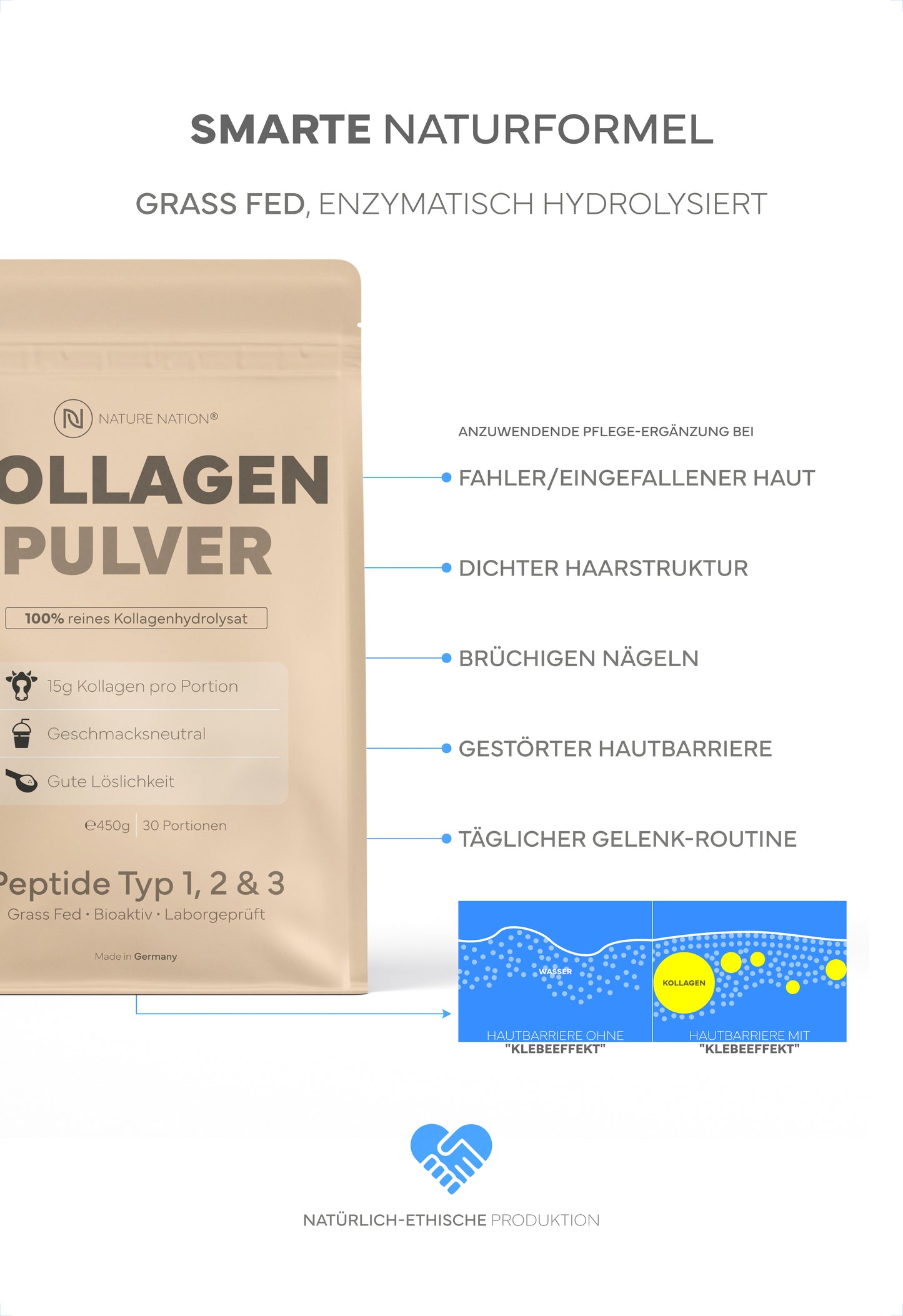 Kollagen Pulver Hydrolysat, 450g - 100% Peptide Typ I, II & III, geschmacksneutral & leicht löslich